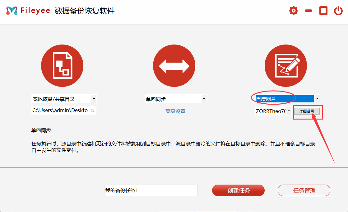 步骤2,在最右边选择“百度云盘”,然后点击“详细设置”添加百度网盘用户授权,具体步骤请看下图2,授权成功后点击“确定”按钮。