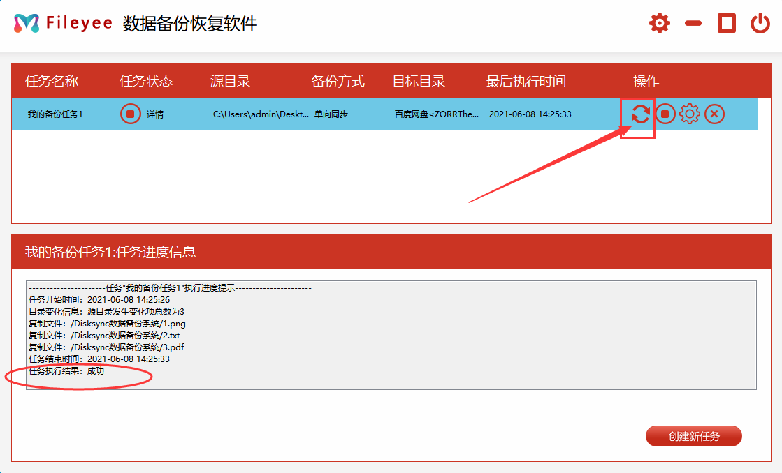 步骤4,点击“开始”图标按钮,软件就开启执行备份操作,当进度信息显示成功的时候,说明文件成功自动备份到百度网盘了。