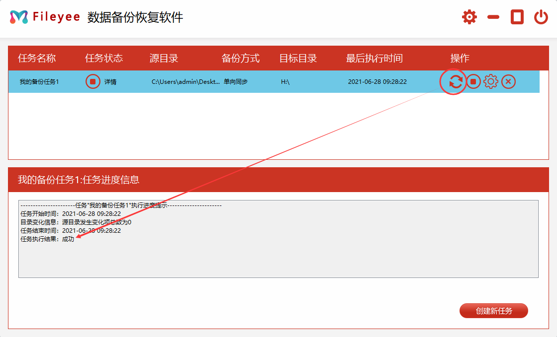 步骤4,任务创建成功后会自动跳转至任务管理的页面,我们点击这个任务右边的【开始】按钮,执行第一次自动备份任务,当执行结果显示为“成功”的时候,说明电脑文件成功备份到了FTP服务器。