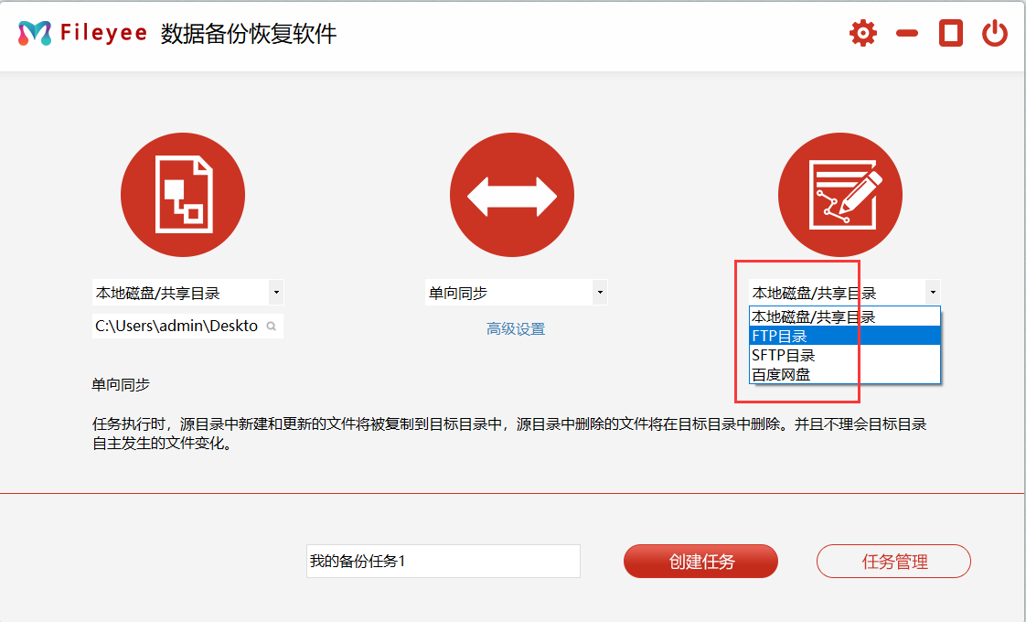 第1步,打开安装好的FlieYee数据备份恢复,软件左边选择“本地磁盘/共享目录”,然后添加电脑中需要备份的文件所在文件夹;中间设置文件同步的方式,根据自己的需求选择即可。