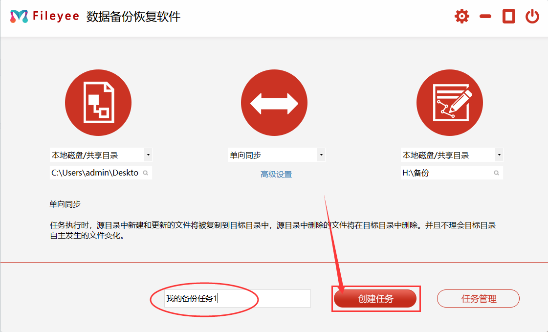 步骤2,如下图所示对软件进行配置,左边设置备份源,选择电脑中需要进行备份的文件夹;中间选择适合自己需求的文件同步方式,我这里选择“单向同步”;右边设置备份目标,选择移动硬盘中备份的位置。