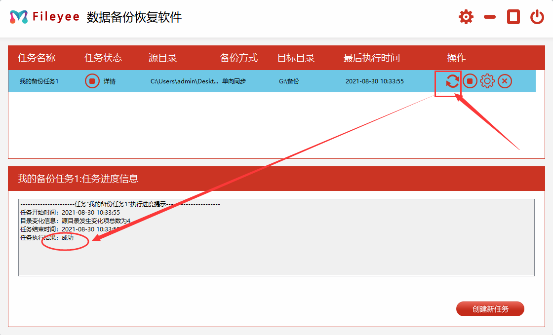 第五步,找到刚刚创建的备份任务,点击对应的“开始”按钮,启动备份,当执行结果为成功的时候说明备份成功了。