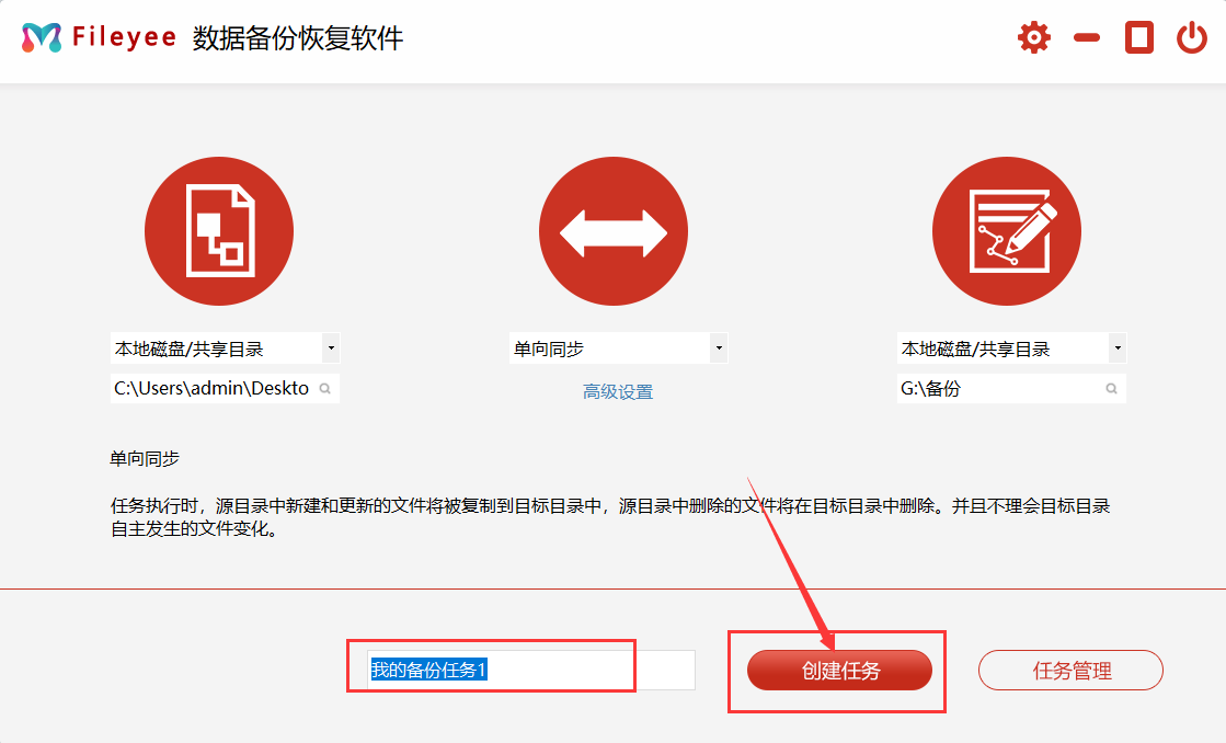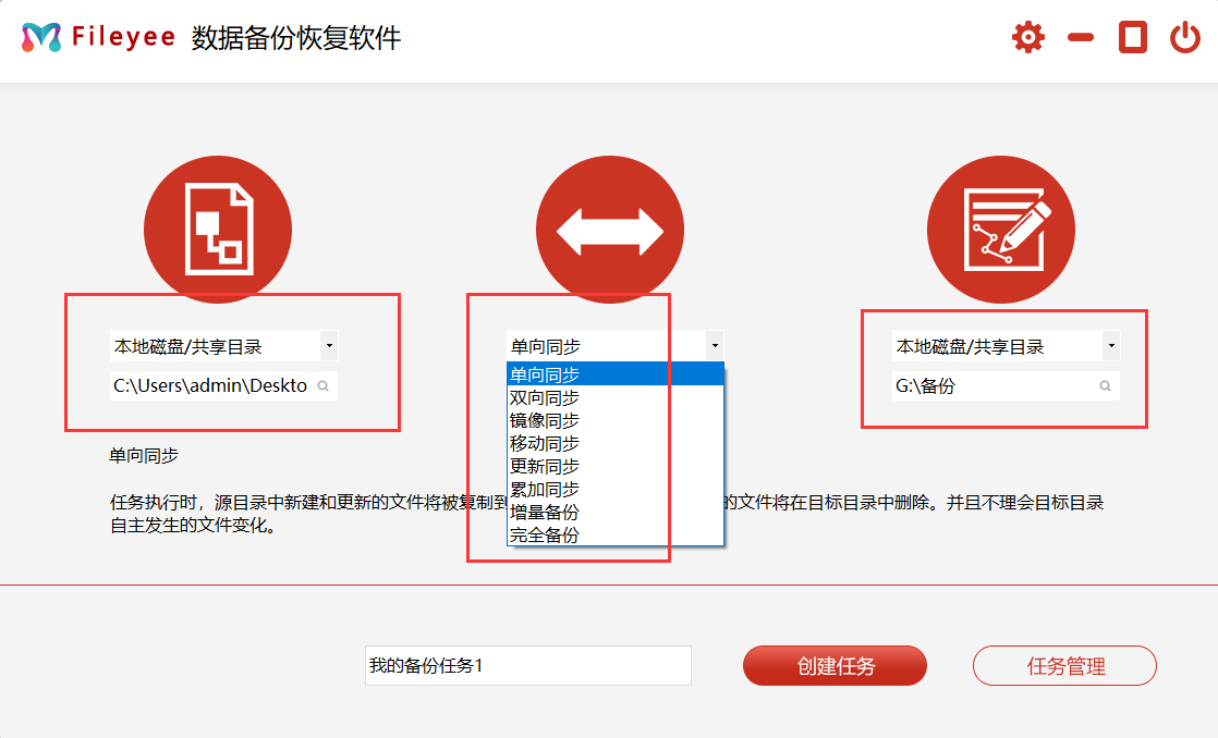 首先,大家可以自行从浏览器中获取“Fileyee数据备份恢复”软件,左边选择需要备份的文件所在的文件夹目录;中间选择适合自己需求的备份同步方式;右边选择备份目标,也就是文件备份的位置,目前支持备份到磁盘/U盘/移动硬盘/百度网盘/服务器。