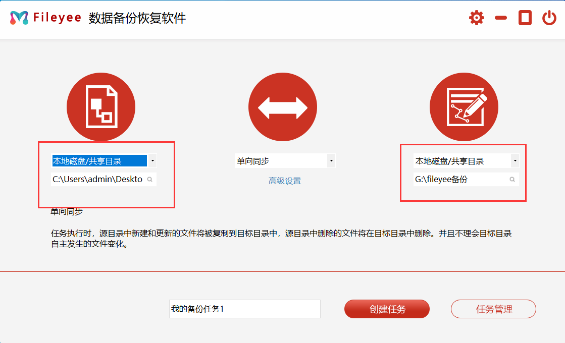 步骤1,电脑上下载“FileYee数据备份恢复”工具软件后安装打开,如下图所示:左边设置电脑上需要备份的文件所在的文件夹;右边设置备份目标,就是文件需要备份到哪里,可以是电脑磁盘、U盘、移动硬盘、百度网盘等。