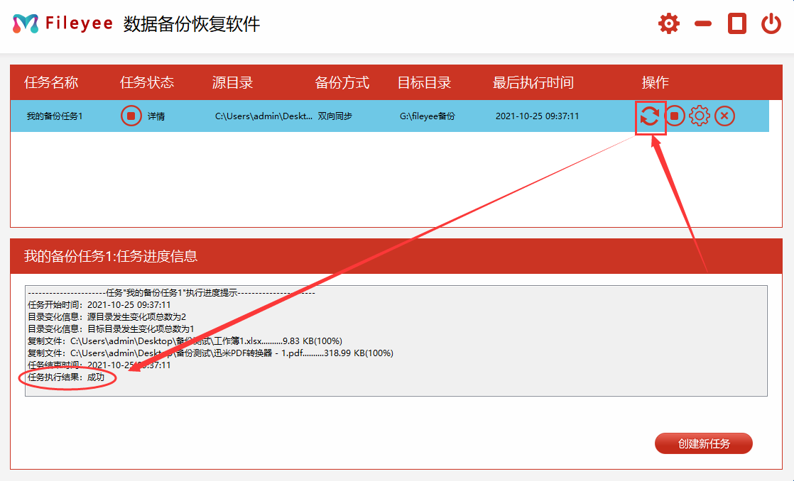 步骤4,点击备份任务右边对应的“开始”图标按钮,启动备份任务,执行结果为“成功”的时候说明备份完成了。