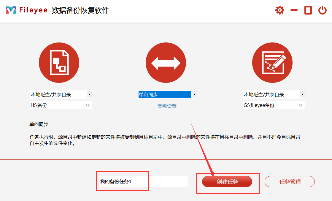 步骤1,下载“FileYee数据备份恢复”软件后安装打开,然后进行设置,左边设置备份源,选择你U盘中需要备份的文件夹;中间选择适合的数据同步方式;右边设置备份目标,选择文件需要备份到哪个文件夹里。