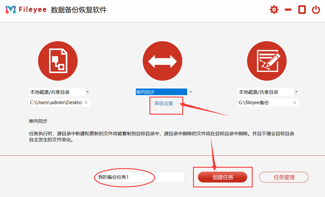 步骤1,下载“FileYee数据备份恢复”软件后安装打开,然后进行设置,如下图所示在左右两边分别设置备份目录和备份目标的位置,然后中间设置文件备份的同步方式。
