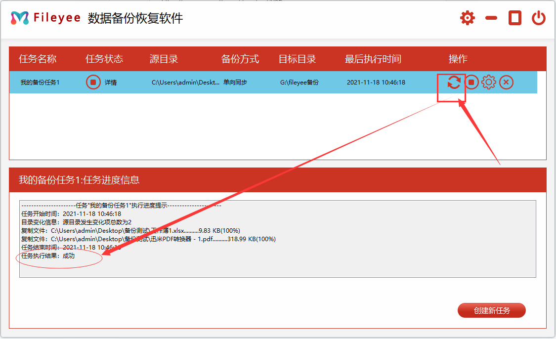 步骤3,点击刚刚创建的任务右边对应的“开始”图片启动备份任务,当执行结果为“成功”的时候说明备份成功。之后软件会按照设置好的参数定时自动备份。