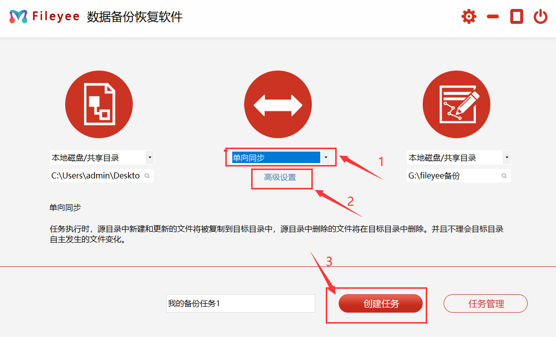 步骤2,选择文件同步的方式,有很多种,根据自己的备份需求选择一个。然后点击高级设置按钮,设置自动备份的相关参数,如果不设置软件会自动一个小时备份一次。最后输入备份任务名,点击“创建任务”按钮,创建备份任务。