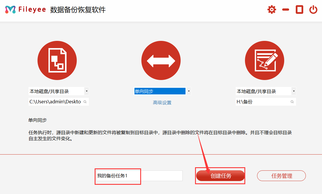 第3,设置文件备份任务名称,然后点击“创建文件”按钮创建备份任务,创建成功后自动跳转到任务管理页面。