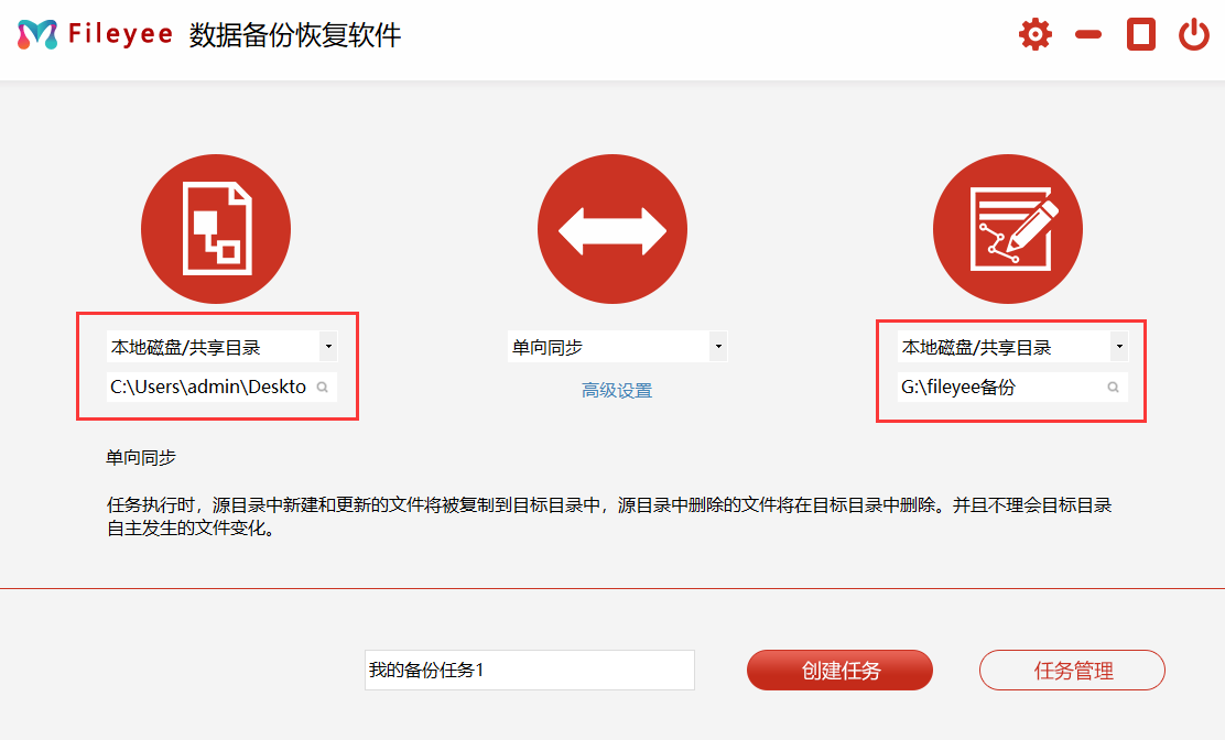步骤1,通过上面的下载链接,将FileYee数据备份恢复安装包下载到电脑,并安装打开,我们需要做的是新建一个自动备份的任务。首先,左右两边分别设置备份源和备份目标。