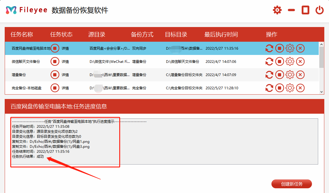 任务创建完成后,来到任务管理中心,可直接查看刚刚创建的备份任务。FileYee目前支持创建多个任务,也就是说你可以同时让多个备份任务并存。