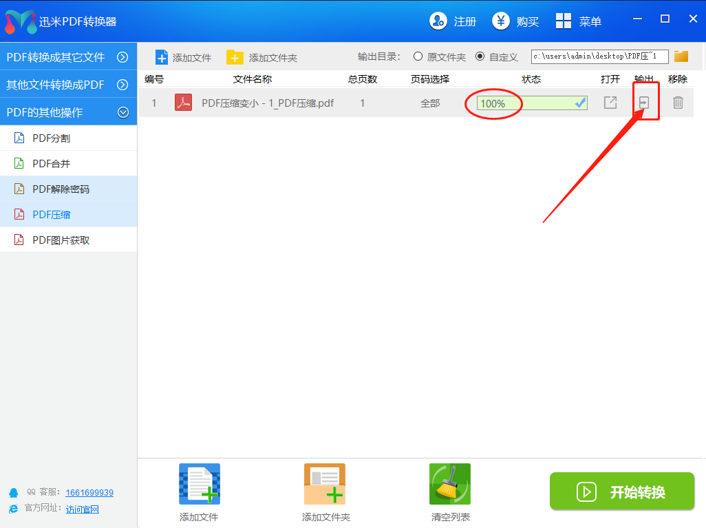 步骤4:稍等片刻之后,当状态栏下面的绿色进度条变成100%说明压缩完成,点击右侧按钮就可以打开压缩后PDF文件所在的文件夹了。
