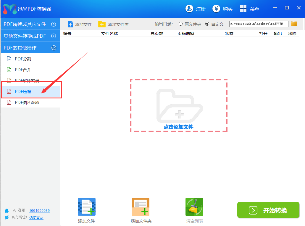 第1步:打开安装好的迅米PDF转换器,软件主界面的左边列表为所有功能列表,我们依次找到并点击【PDF的其他操作】-【PDF压缩】功能,然后进行下一步操作。