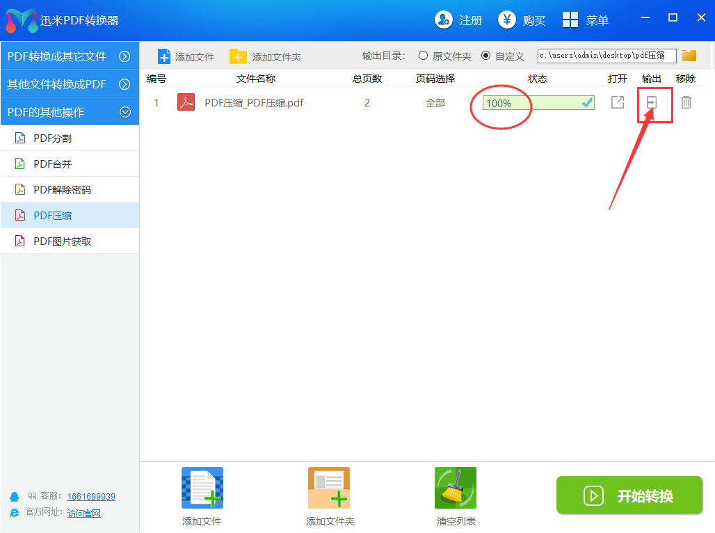 第4步:当转换进度条变成100%的时候,说明软件成功的将pdf文件压缩变小了。我们只需要点击输出图标就可以打开压缩后PDF所在文件夹了。