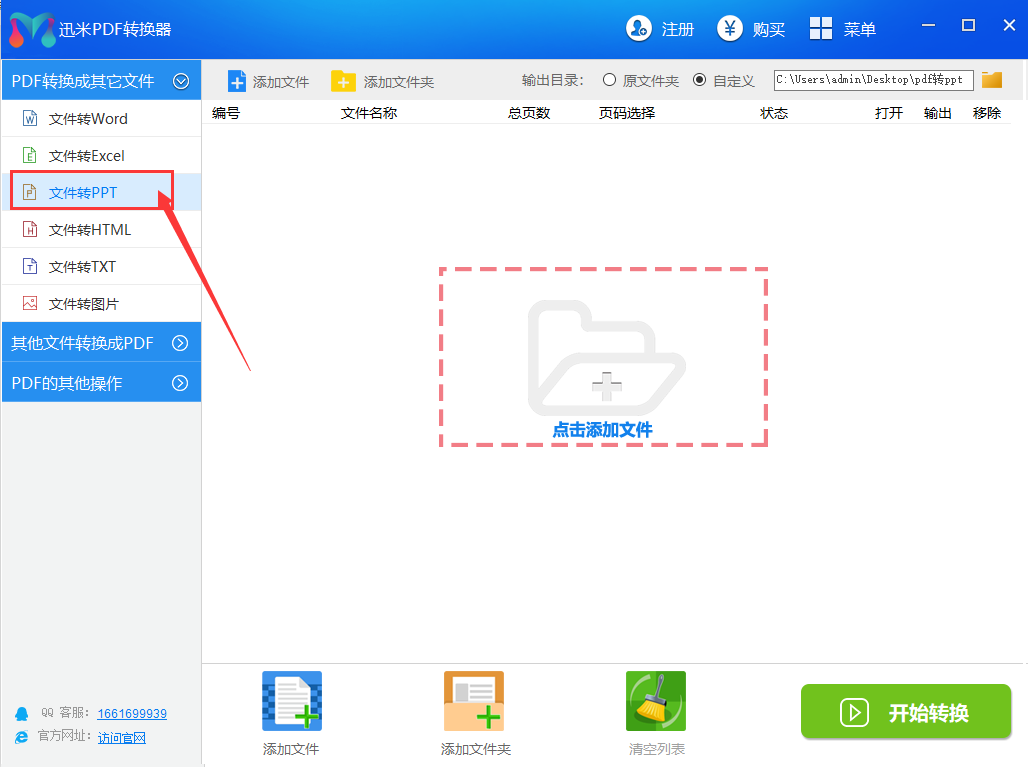 步骤1,打开安装好的迅米PDF转换器,在软件界面左边的蓝色别表中找到并点击【PDF转换成其它文件】-【文件转ppt】功能,然后进入下一步操作。