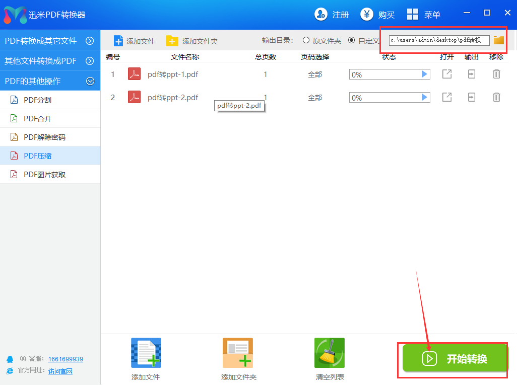 步骤3,如下图所示在软件右上方位置设置文件压缩后的保存位置,软件默认是保存到电脑的桌面;然后点击下面的【开始转换】按钮,软件就启动压缩程序了,我们等待即可。