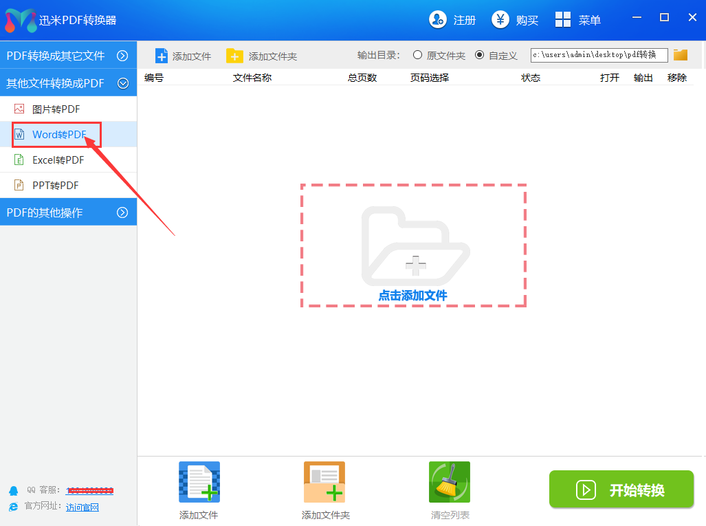 步骤1,在电脑上安装迅米PDF转换器,然后打开软件,在左边的功能列表中依次找到并点击【其他文件转成PDF-Word转PDF】功能。