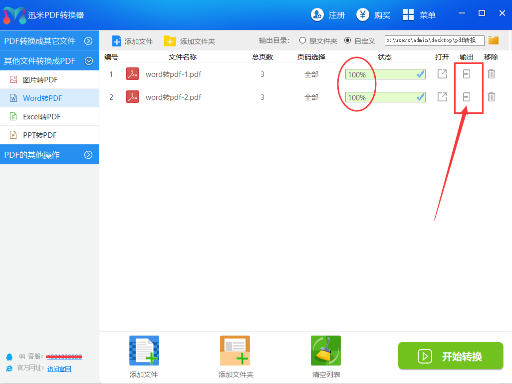 步骤4,不需要很长的时间,当文件名称右边对应的转换进度条变成100%的时候,说明这个word文件成功的转换成了pdf文件,点击右边的输出按钮就可以打开和查看转换后的文件了。