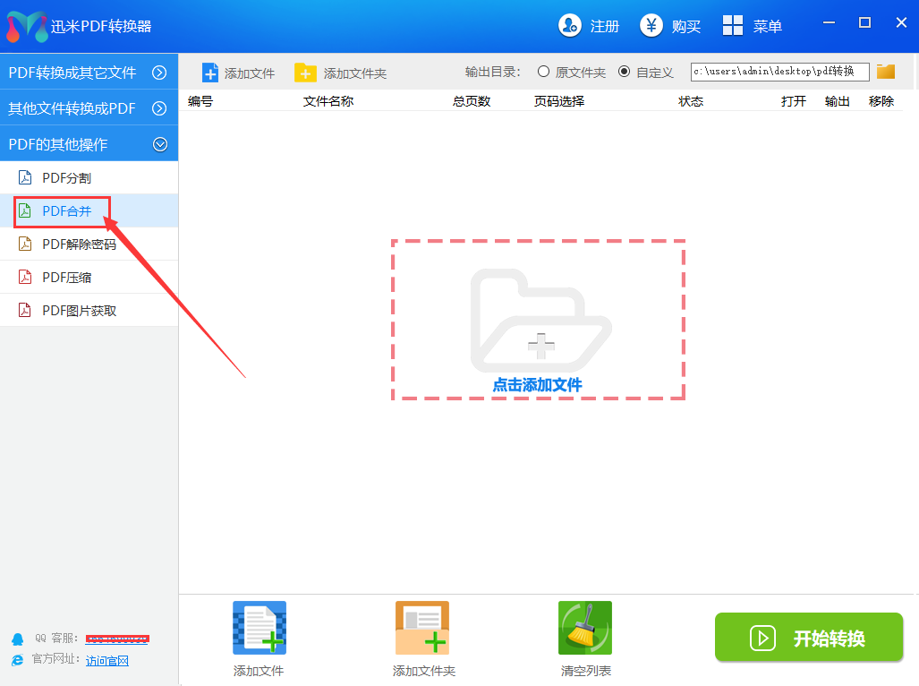 步骤1,打开安装好的迅米PDF转换器软件,找到并点击左边功能别表中的【PDF的其他操作-PDF合并】功能。