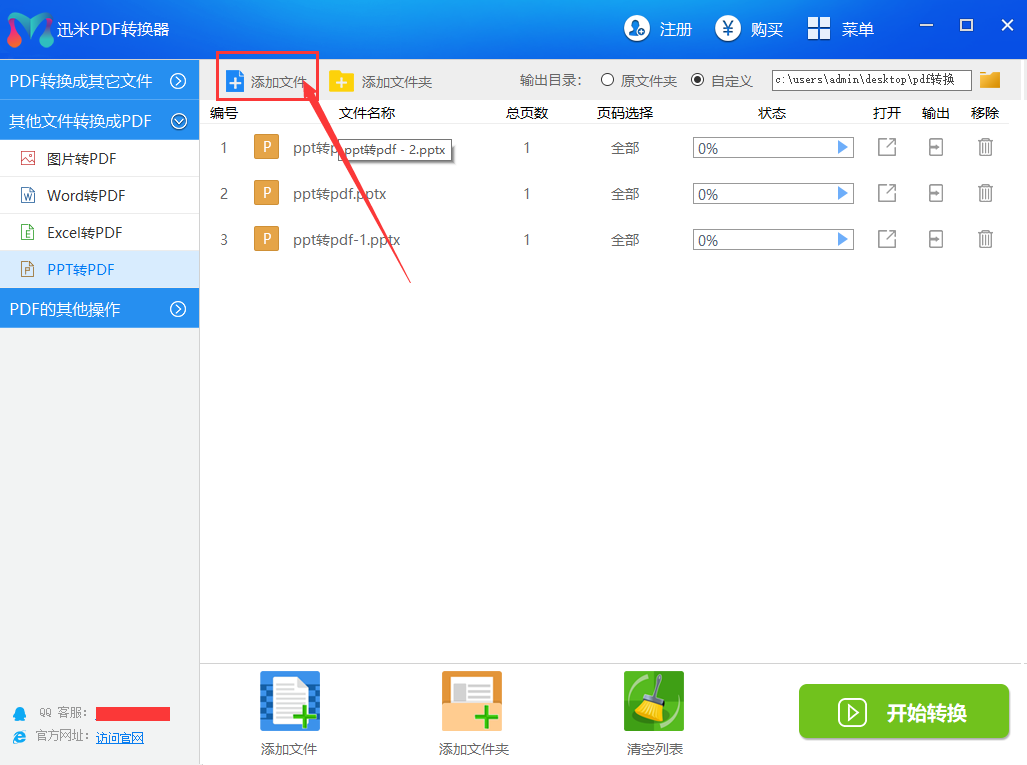 步骤2,点击软件中的【添加文件】按钮,将需要转换成pdf的PPT文件全部添加到软件中,软件支持批量添加和批量转换。