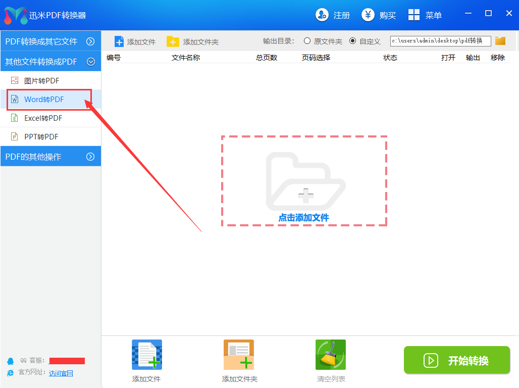 首先,打开电脑上已经安装好的迅米PDF转换器软件,并选择对应的转换功能选项。一般情况下,想要实现Word批量转PDF,可以直接选择“其它文件转PDF文件”中的“Word转PDF”。