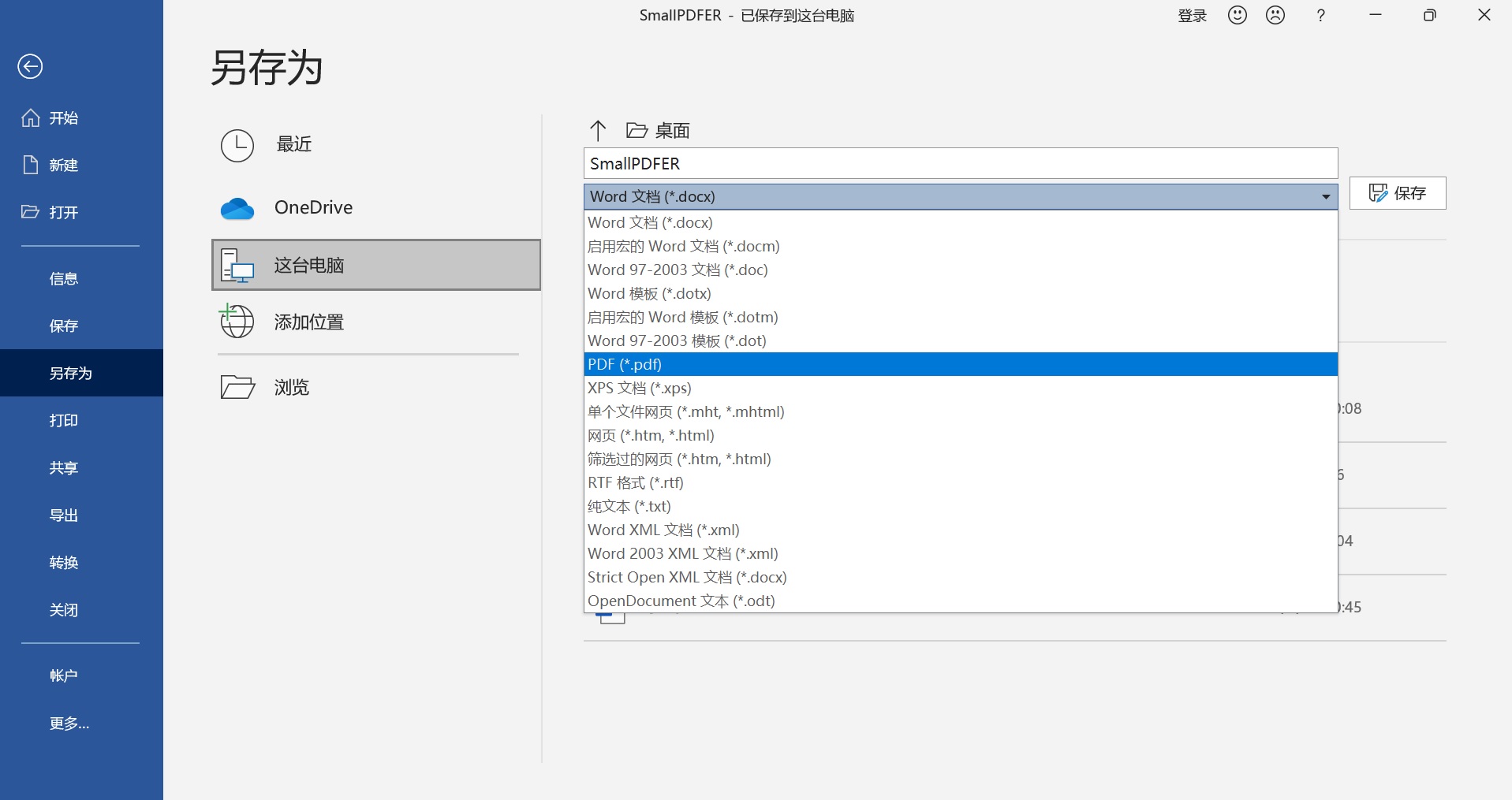 在我们编辑完文档将其保存的时候,可以直接选择将文档保存为我们需要的PDF格式,具体的操作步骤如下:  首先,点击文档编辑界面左上角的【文件】,找到【另存为】,在保存文档副本中选择【其他格式】。然后,在【另存文件】中设置文件名,选择需要保存的位置,将文件类型修改为【PDF文件格式】。最后,完成之后可以直接在该文件保存的位置查看被保存为PDF格式的文档。