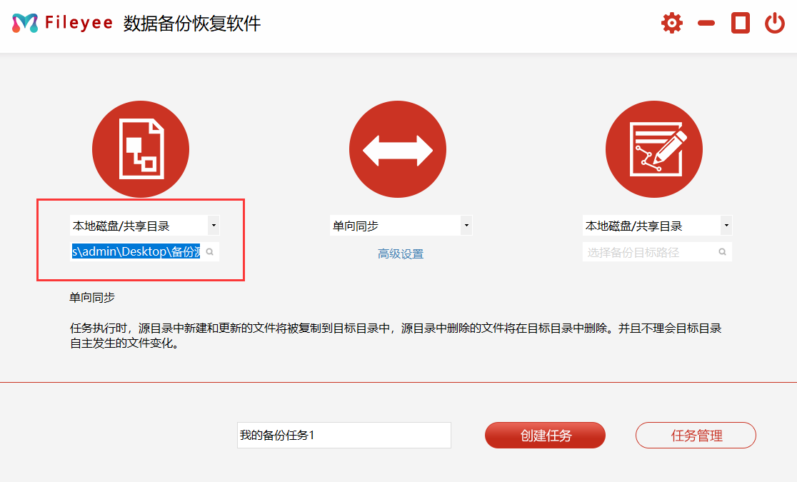 步骤二,然后,选择文件传输的方式。目前,FileYee有多种方式,包括:单向同步、双向同步、增量同步、镜像同步、移动同步等等。简单一点的备份,可以直接勾选“单向备份”;
