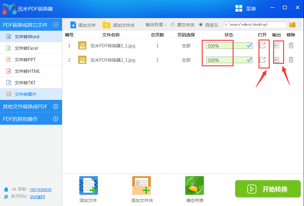 步骤4、当文件名称右侧的转换进度条变成100%时说明转换完成了,点击“打开”按钮变可查看转换成的图片,点击“输出”按钮即可打开图片所在文件夹,进行复制。