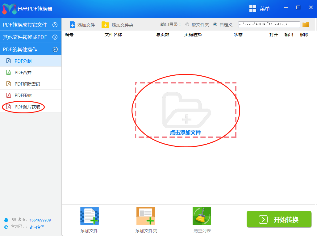 二,打开迅米PDF转换器软件,找到“PDF其他操作-PDF图片获取”并点击。点击右边区域,添加PDF文件,注意可以同时添加多个文件,同时提取图片效率更高。