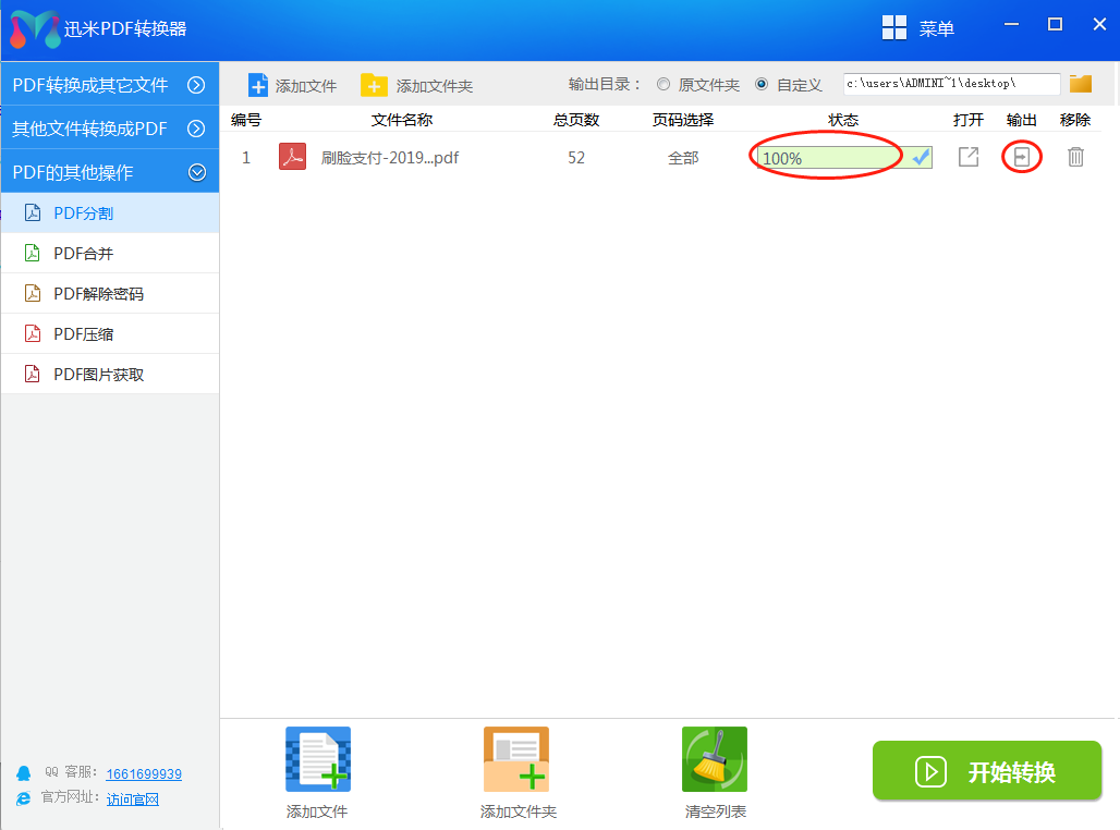 四,当转换进度条变成100%时,说明图片全部提取出来了。这时候只要点击右边的“输出”按钮,即可打开图片的保存位置。