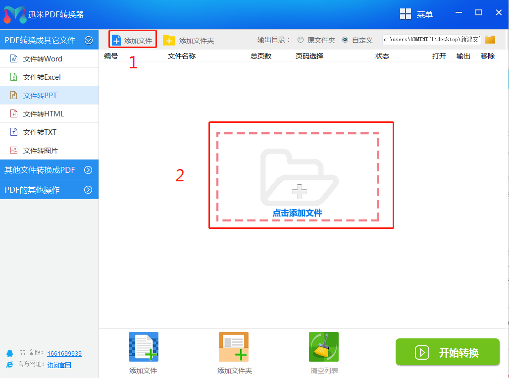 步骤1:安装好迅米PDF转换器后打开软件,软件左侧为软件的功能列表区,最上面的功能为PDF转换其他文件,我们要做的是PDF转PPT,那我们选择并点击“文件转PPT”.