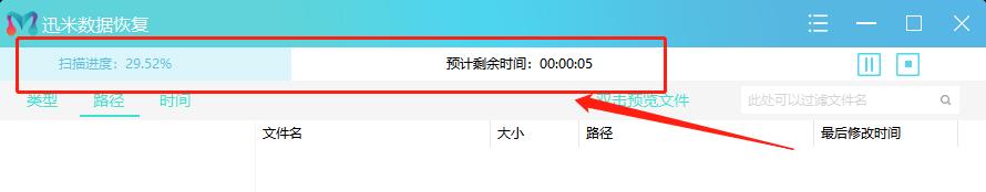 点击“扫描”,如下所示会看到扫描进度,一般普通扫描1分钟即可完成,扫描文件后会出现该磁盘内所有的历史文件。如果没有做到自己想要的文件,那么就点击深度扫描。